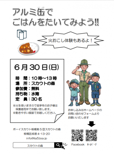 6月30日(日)10時~13時、スカウトの森にて開催いたします。参加費は無料。水筒(飲み物)だけ持ってきてくださいね。ファイヤースターターを使って火おこし体験もできますよ。ぜひ遊びに来てくださいね! イベント情報 2024/05/27 daido