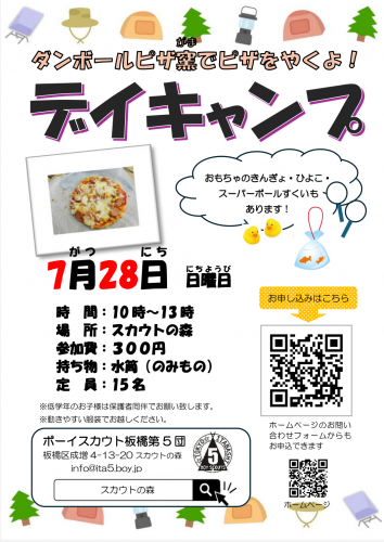 7月28日(日)10時~13時、スカウトの森にて開催いたします。テントやタープを立ててデイキャンプを楽しみましょう!ダンボールで作ったピザ窯でピザを焼いたり、おもちゃの金魚・ひよこ・スーパーボールすくいもありますよ!参加費は300円。先着15名様の募集になります。参加ご希望の方はホームページのお問い合わせフォームまたは下記URLよりお申し込みお願い致します↓